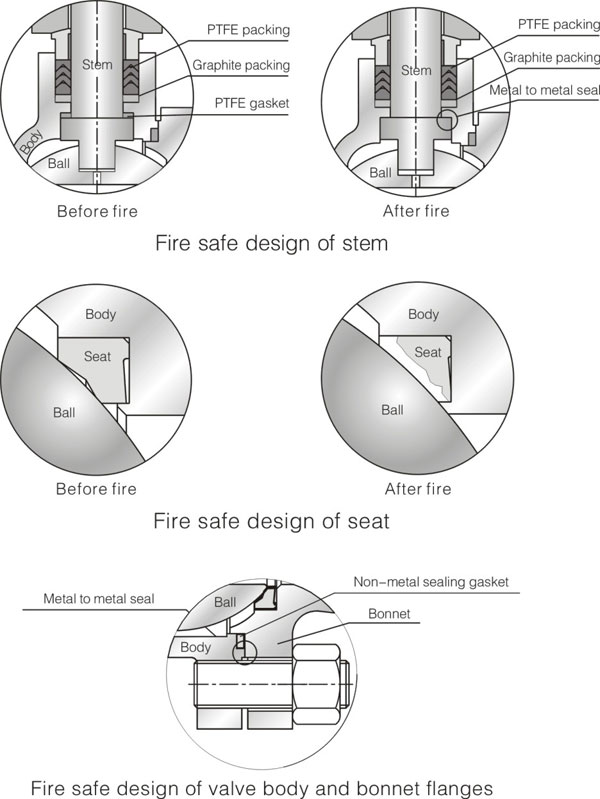 Ognioodporne zawory kulowe wykorzystują kombinację pływającej lub ujarzmionej kuli, uszczelnienia (przeważnie) metal-metal, co zapewnia szczelne odcięcie, jednocześnie zapobiegając wyciekowi z dławicy.
